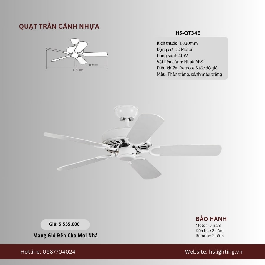 Quạt trần 5 cánh nhựa HS-QT34E...